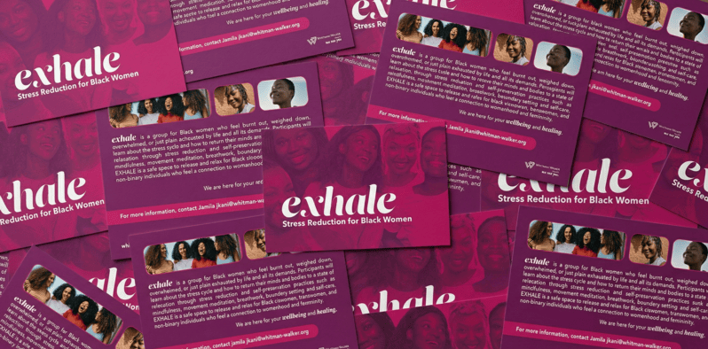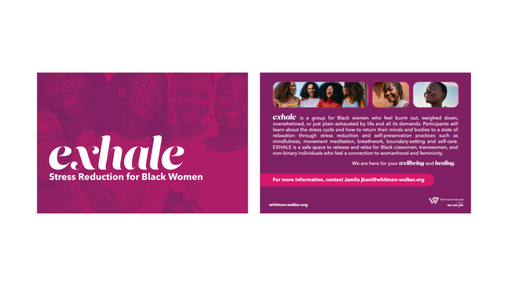 Designed an engaging palm card for Whitman-Walker Health’s “exhale” group, a program specifically focused on stress reduction, self-preservation, and holistic healing for Black women. The card needed to instantly convey a sense of safety, community, and welcome, addressing the target audience of individuals feeling “burnt out, weighed down, overwhelmed, or just plain exhausted by life and all its demands.”